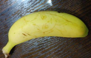 針やつまようじでバナナにうっすら絵を描いてしばらくおくと絵が浮かび上がってくるんです。